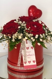 Sweet Kisses is our Valentines special. A petite hat box containing 6 beautiful red roses, decorated with crystal studs complemented with gypsophila and foliage. Presented  in a decorated hat box this design is so pretty it is sure to delight. heart