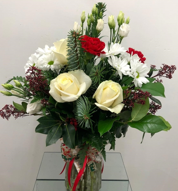 A seasonal selection of flowers and foliage in reds, whites and greens hand-tied and arranged in a glass vase, gift wrapped and ready to display. (vase included)