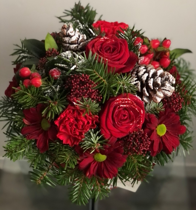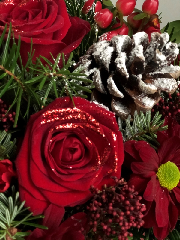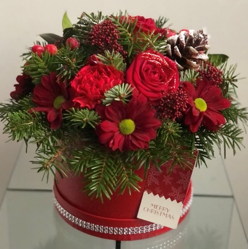 Say Happy Christmas with this beautiful Christmas themed hatbox design. Arranged with red and ruby coloured seasonal flowers, including red roses, snowed cones and seasonal foliage. Loving arranged in a hatbox all ready to display.