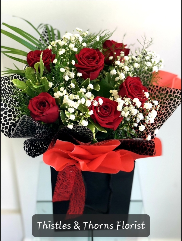Send your loved one six kisses with these six beautiful luxury red roses and foliage, wrapped and arrange in an aqua pack, ready for your loved one to display and enjoy.