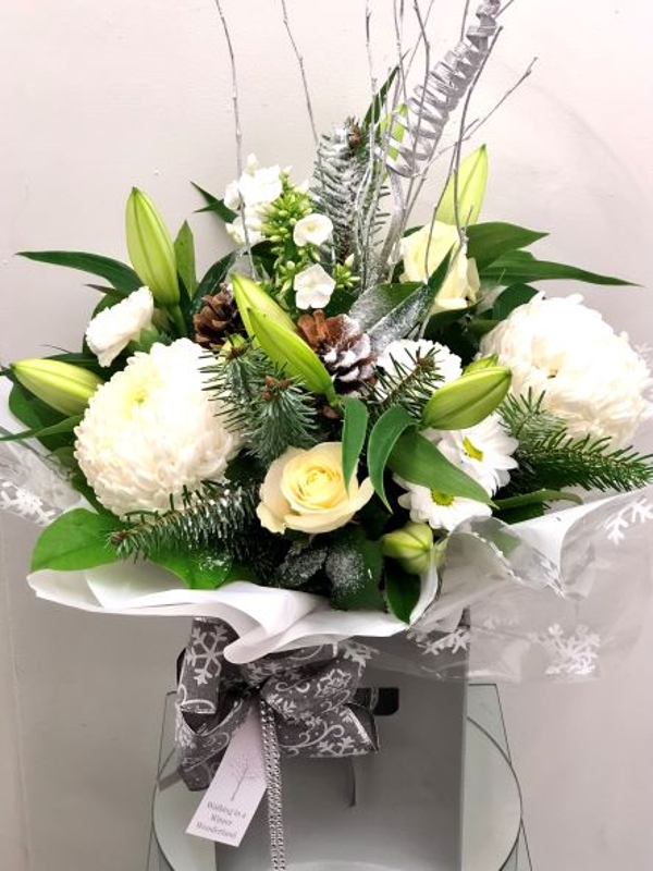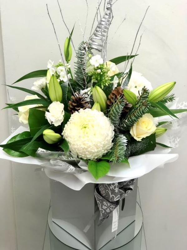 A magical Christmas themed aqua back bouquet. A selection of white and cream seasonal flowers and foliage, including roses and blooms. Selected flowers are delicately hand dusted with glitter to add that extra sparkle. Finished with sliver decorations and twigs, presented gift wrapped and boxed all ready to display.