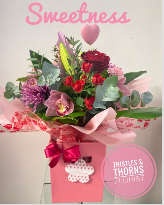 A pretty romantic mixed aqua pack bouquet. Romantic themed flowers in reds and pinks.  Hand-tied in water, gift wrapped and boxed, ready to display and enjoy.