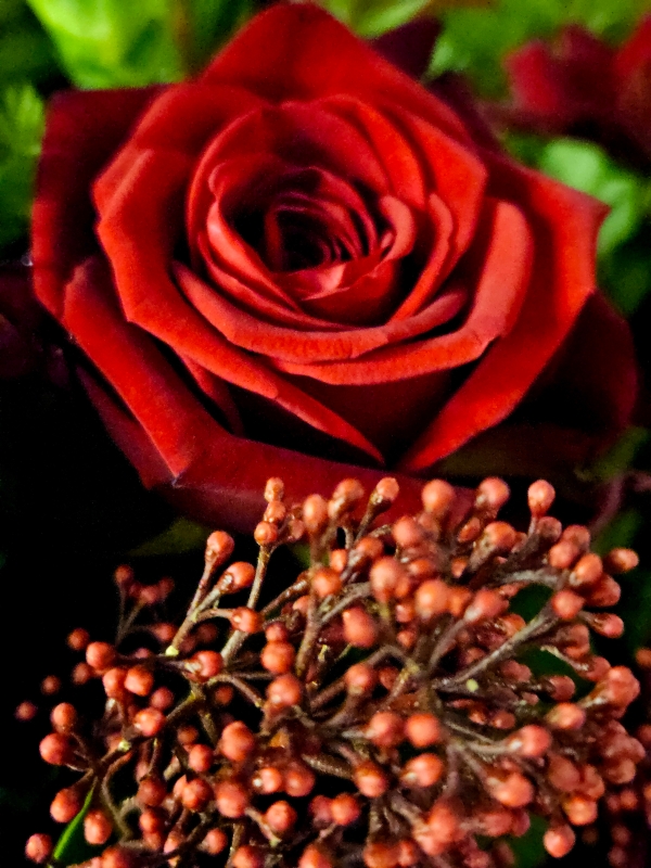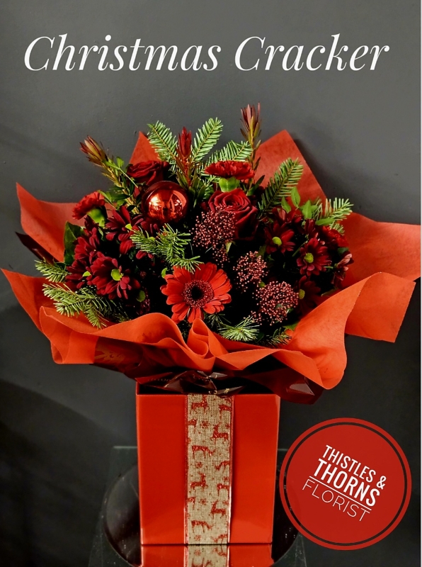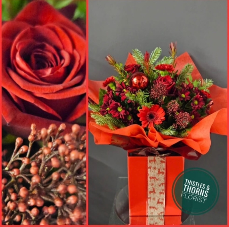 A beautiful Christmas themed aqua bouquet filled with seasonal flowers in rich reds & burgundy shades complemented with seasonal foliage.